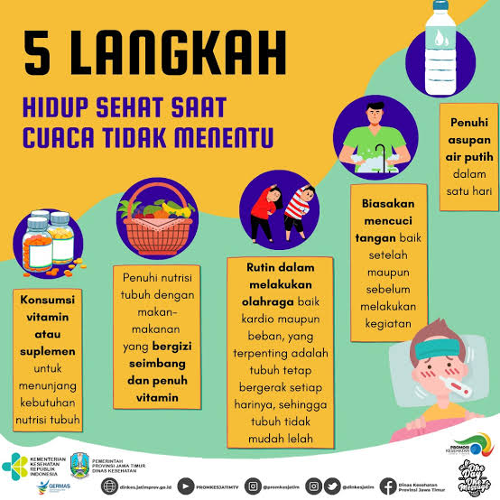 Cuaca yang tidak dapat diprediksi dapat menyebabkan peningkatan kasus penyakit, terutama Infeksi Saluran Pernapasan Akut (ISPA), flu, batuk, dan demam, serta masalah kesehatan lainnya yang disebabkan oleh lingkungan. Untuk tetap sehat selama pergantian musim, kita dapat melakukan beberapa langkah. Langkah-langkah tersebut meliputi mengonsumsi makanan sehat dan seimbang, meningkatkan asupan buah dan sayur, serta minum air yang cukup untuk mendukung sistem kekebalan tubuh.